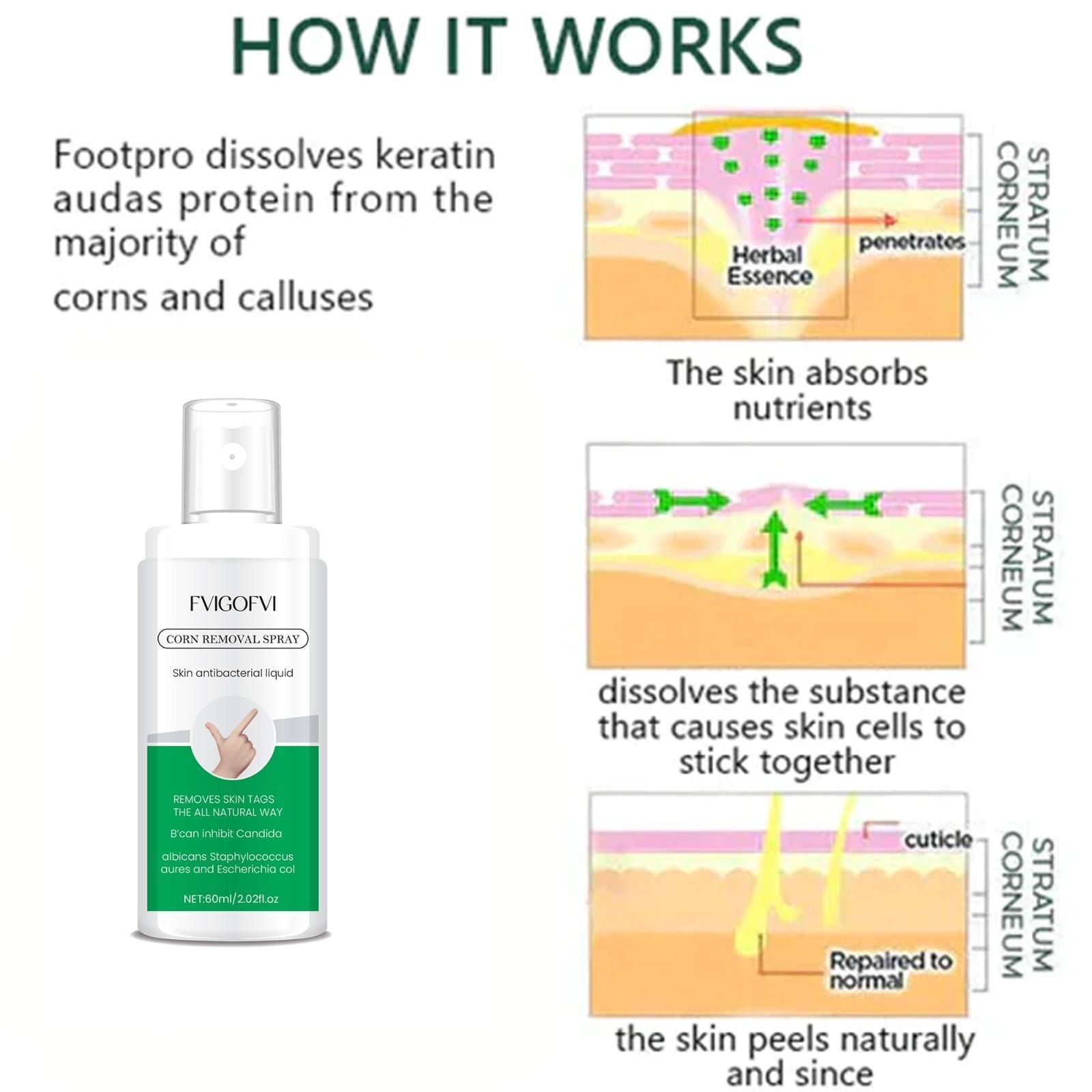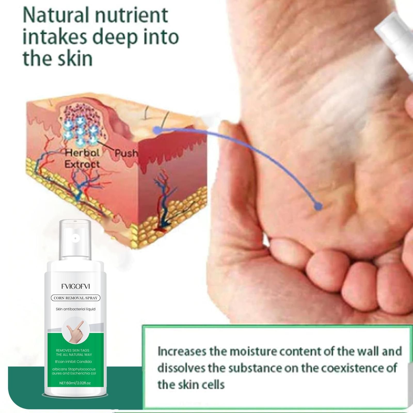 Say goodbye to painful corns and enjoy healthier, smoother skin with Fvigofvi Corn Removal Spray for Skin. This powerful antibacterial liquid is formulated with a unique blend of 25 rich ingredients to gently remove corns while providing soothing relief. Easy to apply and fast-acting, it targets stubborn corns and promotes skin healing. Ideal for those looking for an effective, convenient solution to restore comfort and confidence to their feet.